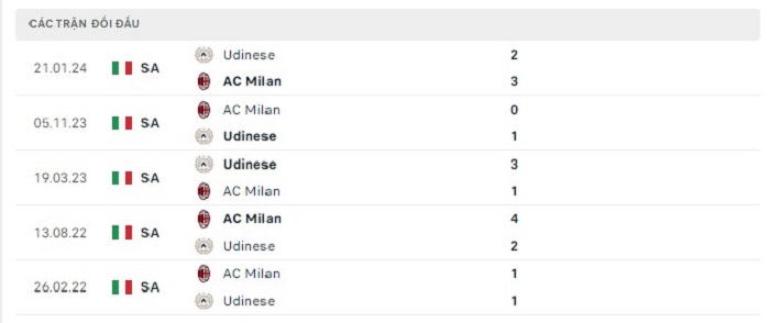 Bảng bóng đá trận đấu AC Milan vs Udinese