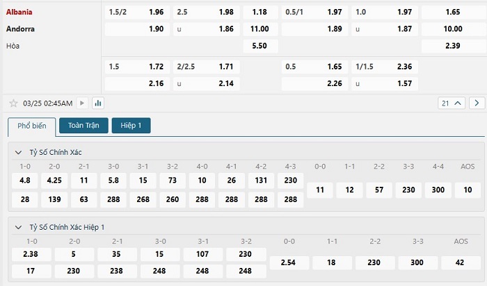 Bảng tỷ lệ kèo bóng đá trận đấu Albania vs Andorra