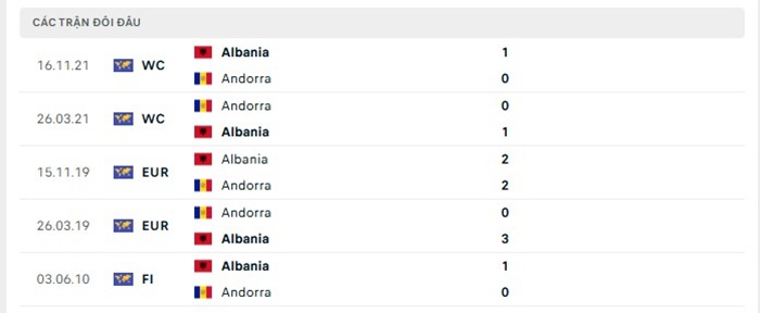 Thống kê có thể thấy được trong quá khứ thì những trận gặp nhau giữa Albania và Andorra vốn cũng không có quá nhiều bàn thắng ghi được, tuy nhiên trình độ hiện tại giữa hai đội cũng có những mặt chênh lệch với nhau là khá rõ ràng trong khu vực, bên cạnh đó yếu tố về sự cạnh tranh hiệu số với Albania họ cũng cần phải thể hiện sự quyết tâm cao hơn trong việc ghi bàn, đây cũng chính là lý do quan trọng để có thể kỳ vọng tới một trận đấu bùng nổ về mặt tỷ số cho cả hai đội ở lần gặp nhau sắp tới.