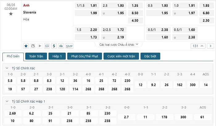 Bảng tỷ lệ kèo bóng đá trận đấu Anh vs Slovenia