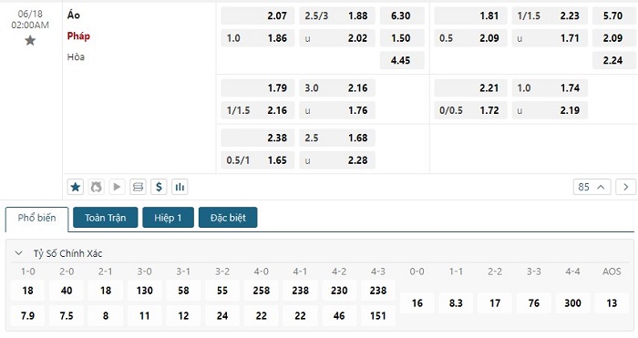 Bảng tỷ lệ kèo bóng đá trận đấu Áo vs Pháp