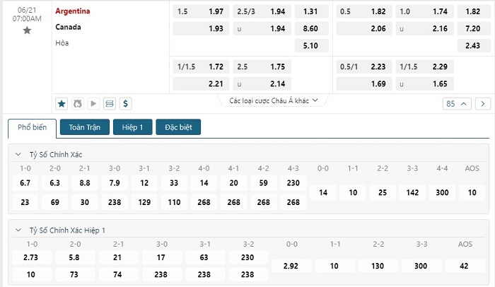 Bảng tỷ lệ kèo bóng đá trận đấu Argentina vs Canada