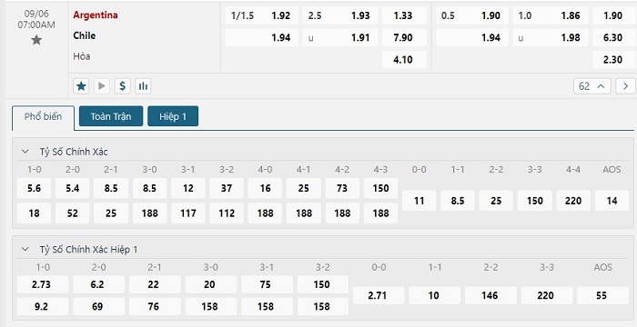 Bảng tỷ lệ kèo bóng đá trận đấu Argentina vs Chile