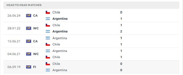 Trong 10 lần gặp nhau gần đây của hai đội thì Argentina vẫn đang có được thành tích bất bại trước Chile với tổng cộng 6 trận thắng và 4 trận hoà theo kèo châu Âu, điều này cho thấy được phần nào đó sự chênh lệch của hai đội về mặt chuyên môn hay chất lượng đội hình vẫn đang là rất lớn. Với thực lực hiện tại của mình thì Argentina cũng sẽ không phải khó khăn để có thể tiếp tục nâng cao thành tích của mình trước Chile bằng một thắng lợi theo kèo châu Âu của trận đấu này để tiếp tục giữ vững ngôi đầu bảng xếp hạng.