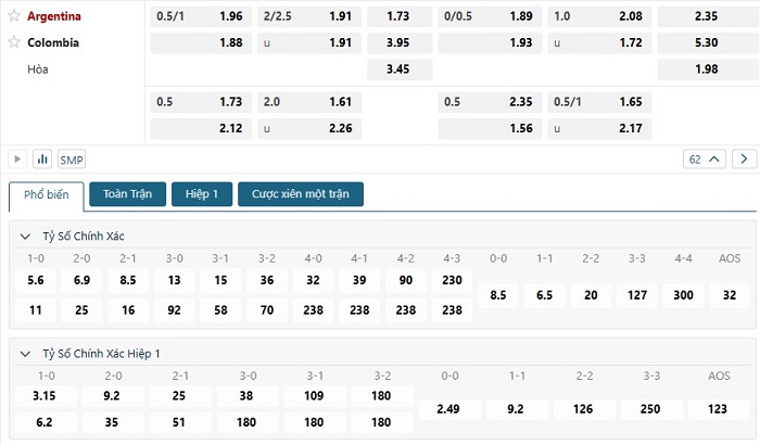 Bảng tỷ lệ kèo bóng đá trận đấu Argentina vs Colombia