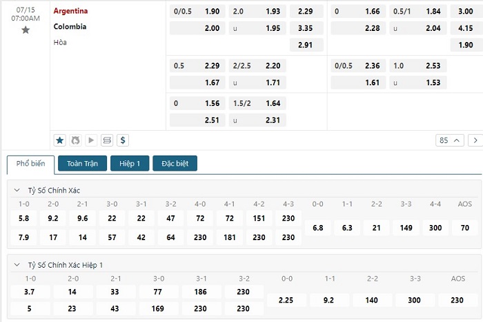 Bảng tỷ lệ kèo bóng đá trận đấu Argentina vs Colombia
