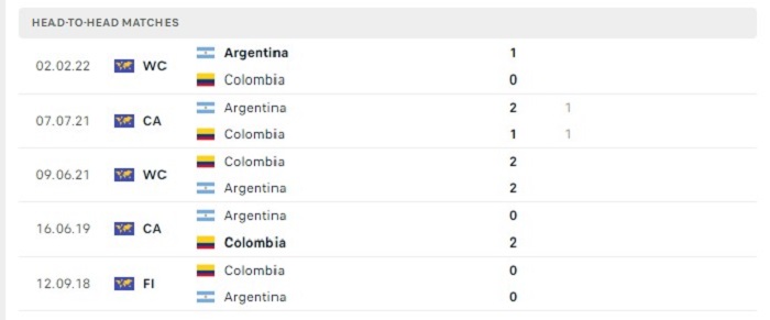 Những lần gặp nhau giữa Argentina vs Colombia trong quá khứ vốn cũng không có quá nhiều bàn thắng ghi được, điều này thấy được khi có tới 7 trong 10 trận gặp nhau tỷ số trận đấu chỉ ở mức 2 bàn trở xuống, trong đó có tới 3 trận đấu đã khép lại với kết quả hoà 0-0 chung cược, bởi vậy mà tỷ số trận đấu sắp tới hoàn toàn có thể lặp lại trong bối cảnh thi đấu chắc chắn của hai đội.