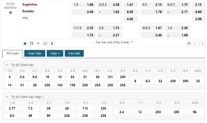 Bảng tỷ lệ kèo bóng đá trận đấu Argentina vs Ecuador