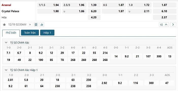 Soi kèo châu Á, kèo chấp Arsenal vs Crystal Palace