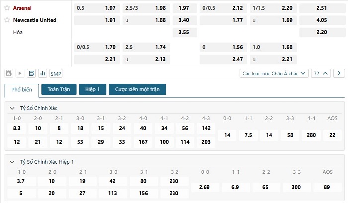 Bảng tỷ lệ kèo bóng đá trận đấu Arsenal vs Newcastle