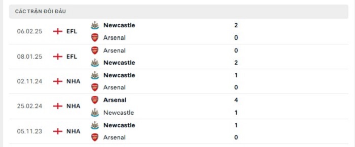 Lịch sử đối đầu của Arsenal vs Newcastle