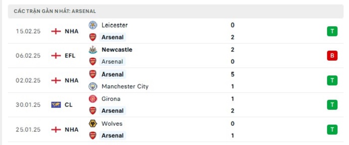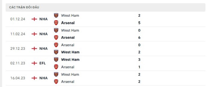 Phong độ gần đây Arsenal vs West Ham