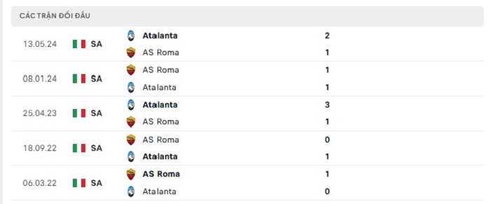Lịch sử đối đầu của AS Roma vs Atalanta