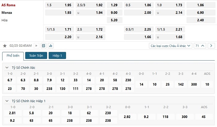 Soi kèo châu Á, kèo chấp AS Roma vs Monza
