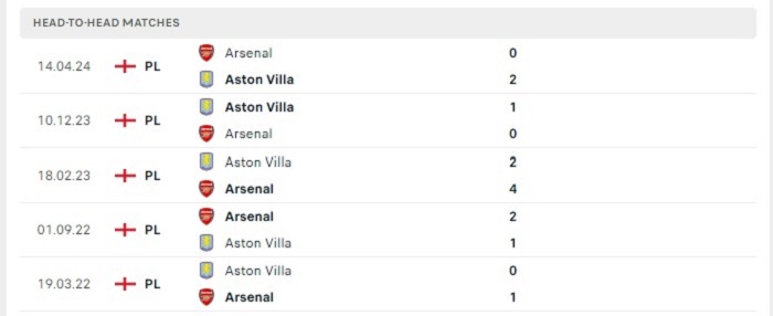 Phong độ gần đây Aston Villa vs Arsenal
