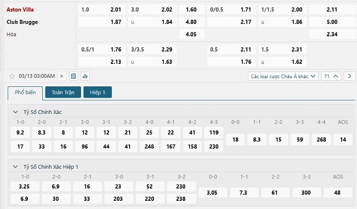 Soi kèo châu Á, kèo chấp Aston Villa vs Club Brugge