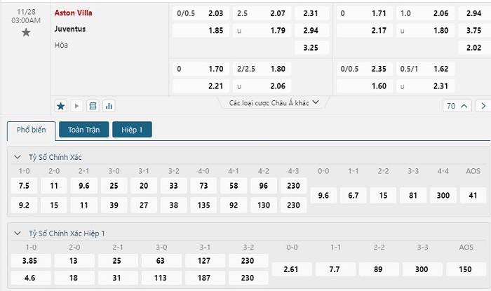 Soi kèo châu Á, kèo chấp Aston Villa vs Juventus