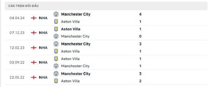 Lịch sử đối đầu của Aston Villa vs Manchester City