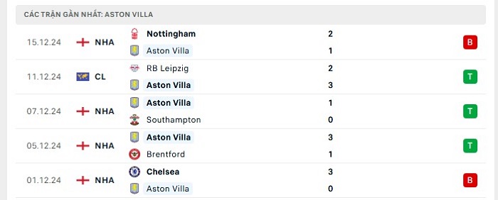 • Phong độ Aston Villa