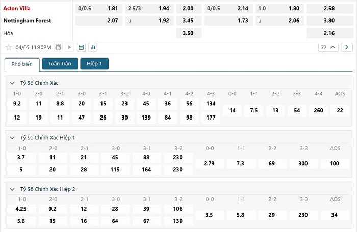 Bảng tỷ lệ kèo bóng đá trận đấu Aston Villa vs Nottingham