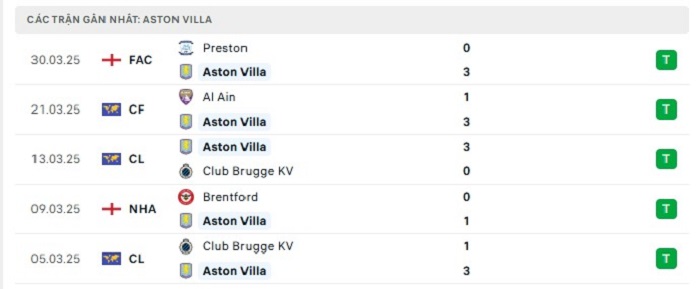 - Phong độ Aston Villa
