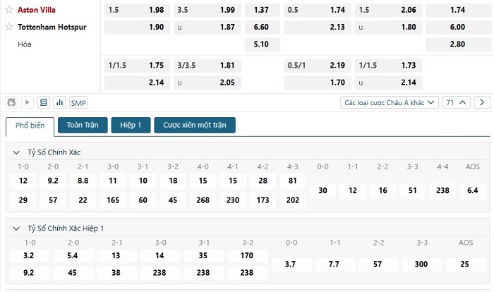 Bảng tỷ lệ kèo bóng đá trận đấu Aston Villa vs Tottenham