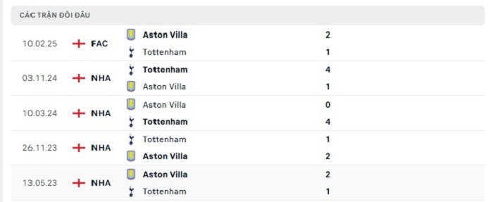 Lịch sử đối đầu của Aston Villa vs Tottenham