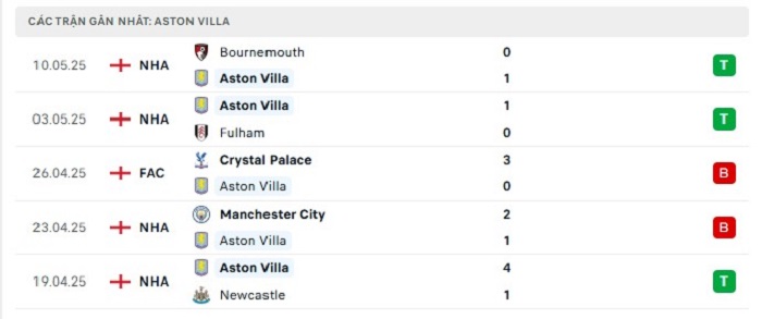 • Phong độ Aston Villa