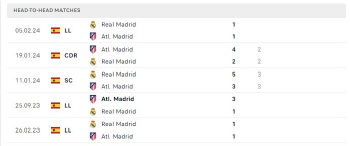 Bảng  bóng đá trận đấu Atletico Madrid vs Real Madrid