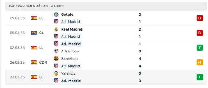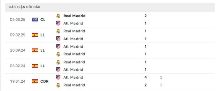 Phong độ gần đây Atletico Madrid vs Real Madrid