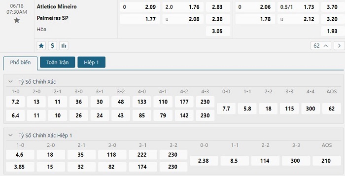 Bảng tỷ lệ kèo bóng đá trận đấu Atletico Mineiro vs Palmeiras