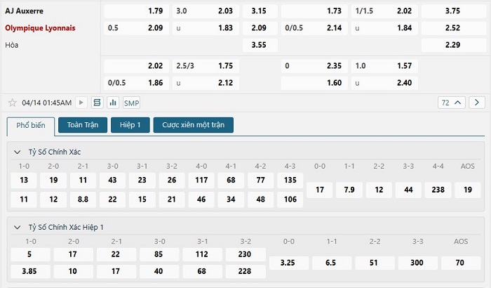 Bảng tỷ lệ kèo bóng đá trận đấu Auxerre vs Lyon