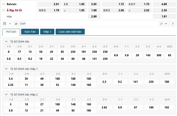Bảng tỷ lệ kèo bóng đá trận đấu Bahrain vs Saudi Arabia
