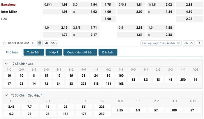 Bảng tỷ lệ kèo bóng đá trận đấu Barcelona vs Inter Milan