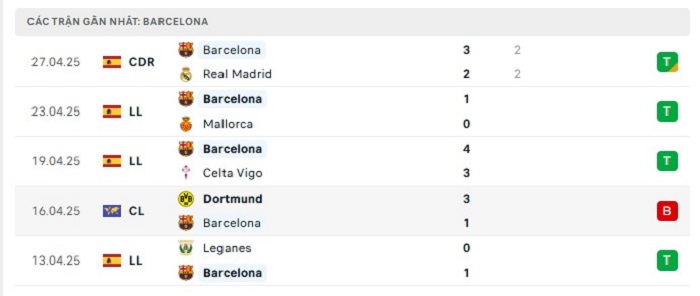 Phong độ gần đây Barcelona vs Inter Milan