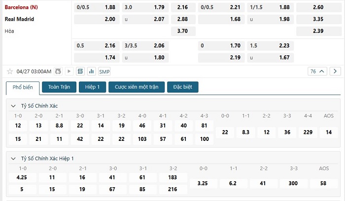 Bảng tỷ lệ kèo bóng đá trận đấu Barcelona vs Real Madrid