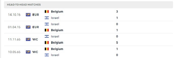 Có hai trong 4 lần gặp nhau của hai đội trước đây tỷ số trận đấu cũng đã xuất hiện khá nhiều trong trận, hàng công của Israel trong thời gian gần đây cũng đang thể hiện được sự hiệu quả trong việc xuyên thủng hàng thủ đối phương. Bỉ có sức mạnh vượt trội hơn thì khả năng ghi bàn của họ cũng được đánh gia cao hơn nhiều so với những trận đấu trước, do đó mà tỷ số của trận đối đầu giữa Bỉ và Israel hoàn toàn có thể xuất hiện nhiều trong trận.