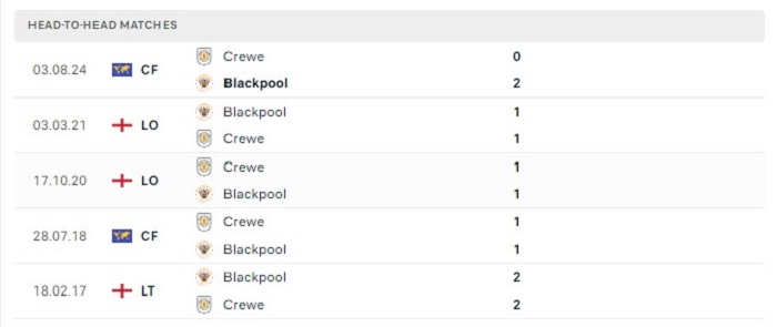 Lịch sử đối đầu của Blackpool vs Crewe