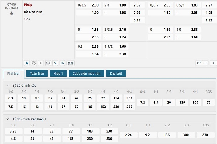 Bảng tỷ lệ kèo bóng đá trận đấu Bồ Đào Nha vs Pháp