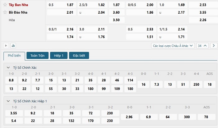 Bảng tỷ lệ kèo bóng đá trận đấu Bồ Đào Nha vs Tây Ban Nha