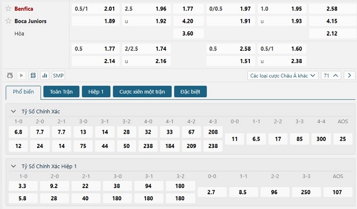 Bảng tỷ lệ kèo bóng đá trận đấu Boca Juniors vs Benfica
