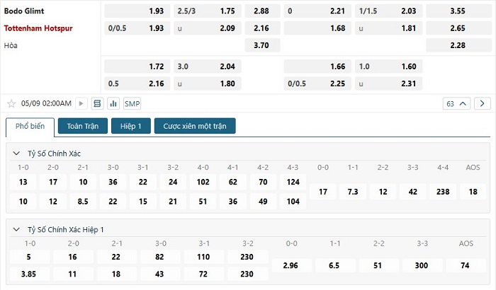 Bảng tỷ lệ kèo bóng đá trận đấu Bodo Glimt vs Tottenham