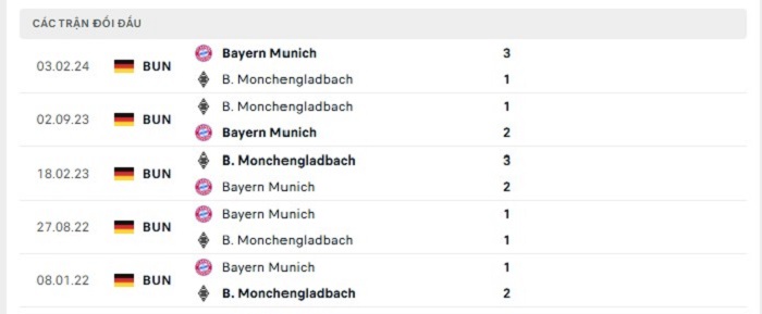 Bảng bóng đá trận đấu Borussia M’gladbach vs Bayern Munich