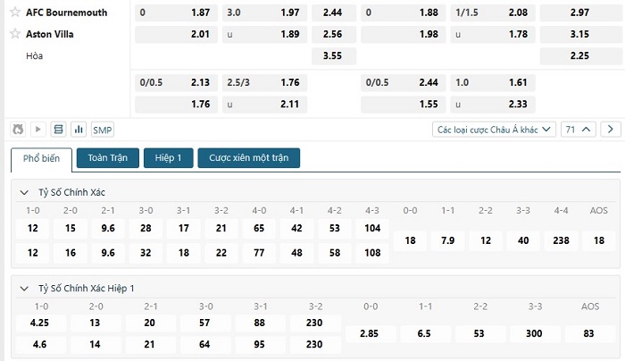 Bảng tỷ lệ kèo bóng đá trận đấu Bournemouth vs Aston Villa