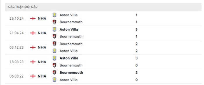 Phong độ gần đây Bournemouth vs Aston Villa