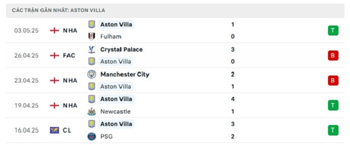 - Phong độ Aston Villa