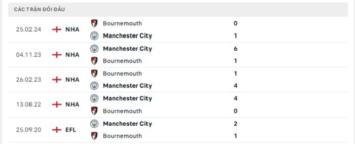 Bảng bóng đá trận đấu Bournemouth vs Manchester City