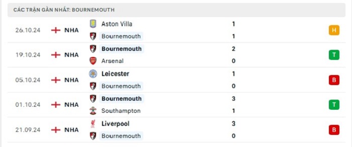 Phong độ gần đây Bournemouth vs Manchester City