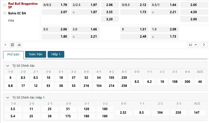 Bảng tỷ lệ kèo bóng đá trận đấu Bragantino vs Bahia