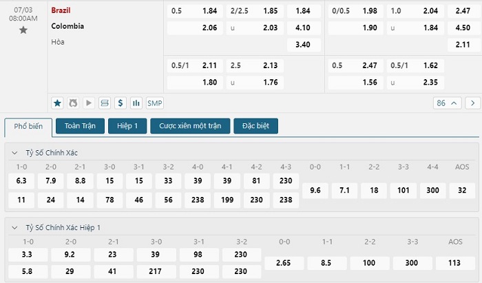 Bảng tỷ lệ kèo bóng đá trận đấu Brazil vs Colombia